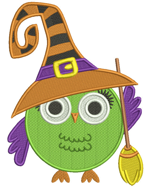 Cute Owl Witch With a Big Hat And a Broom Filled Machine Embroidery Design Digitized Pattern