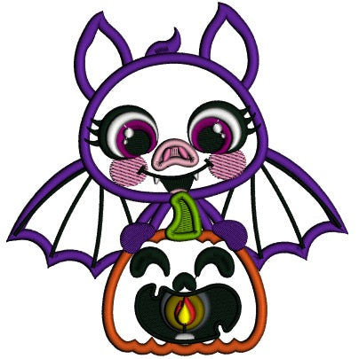 Cute Vampire Bat Sitting On The Pumpkin Applique Halloween Machine Embroidery Design Digitized Pattern