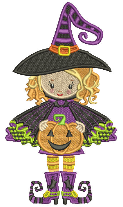 Cute Witch With Big Hat Holding a Pumpkin Halloween Filled Machine Embroidery Design Digitized Pattern