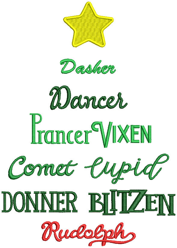 Dasher Dancer Prancer Vixen Comet Cupid Donner Blitzen Rudolph Christmas Tree Filled Machine Embroidery Design Digitized Pattern