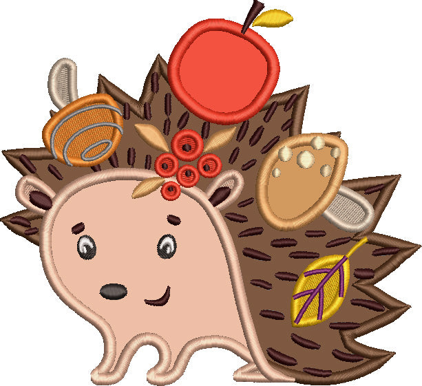 Cute Hedgehog With Apple Mashroom and Fall Flowers Applique Machine Embroidery Design Digitized Pattern - 16417