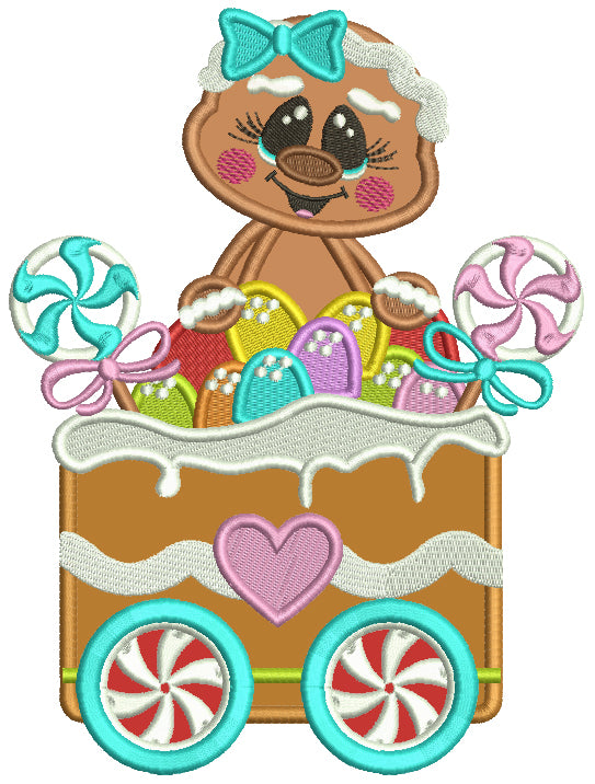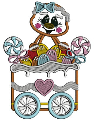 Gingerbread Girl Sitting Inside a Christmas Wagon Applique Christmas Machine Embroidery Design Digitized Pattern