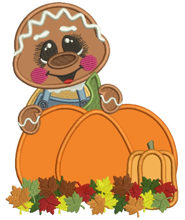 Gingerbread Man Behind a Huge Pumpkin Applique Filled Thanksgiving Machine Embroidery Design Digitized Pattern