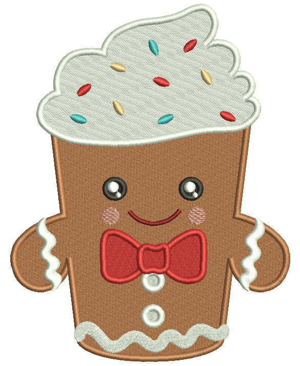 Gingerbread Man Cupcake Wearing a Big Red Bow Christmas Filled Machine Embroidery Design Digitized Pattern