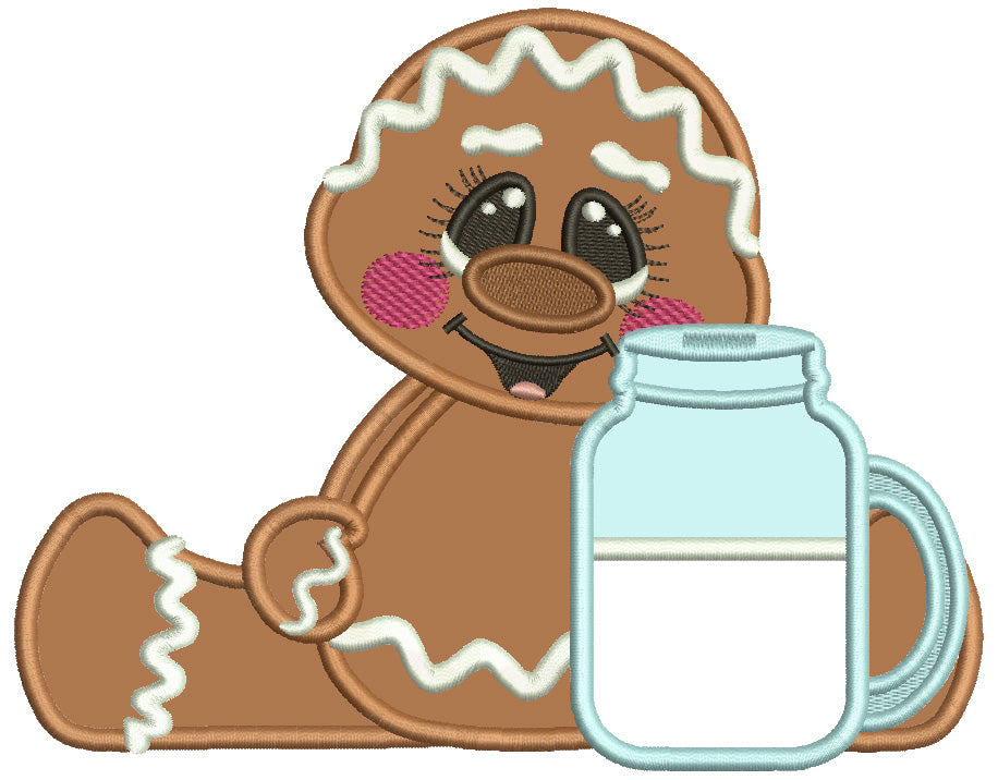 Gingerbread Man Holding Jar Of Milk Applique Machine Embroidery Design Digitized Pattern