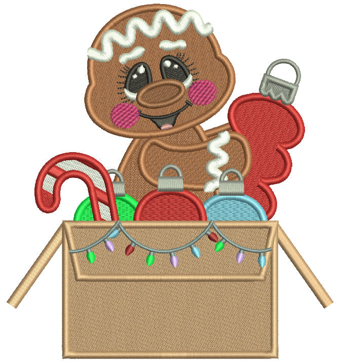 Gingerbread Man Sitting In The Box Holding Christmas Decorations Filled Machine Embroidery Design Digitized Pattern