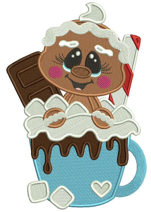 Gingerbread Man Sitting Inside Cocoa Cup Filled Christmas Machine Embroidery Design Digitized Pattern