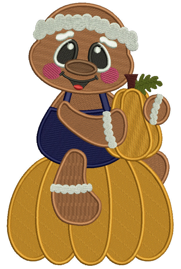Gingerbread Man Sitting On the Big Pumpkin And Holding a Small Pumpkin Fall Filled Machine Embroidery Design Digitized Pattern