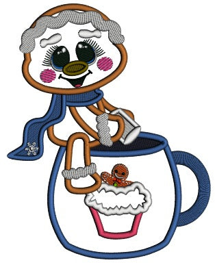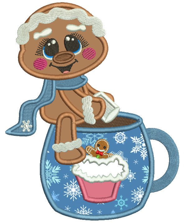 Gingerbread Man Sitting On The Cup Of Hot Cocoa Christmas Applique Machine Embroidery Design Digitized Pattern