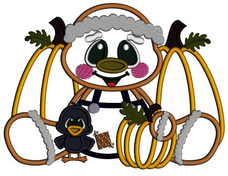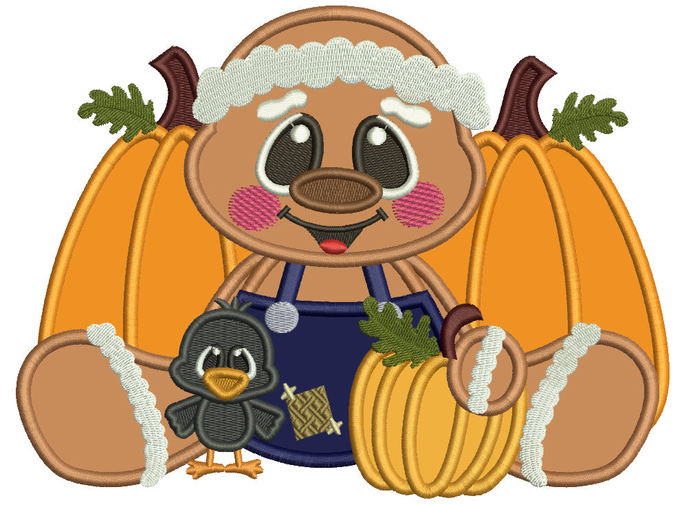 Gingerbread Man With a Little Crow Sitting Next To Pumpkins Thanksgiving Applique Machine Embroidery Design Digitized Pattern