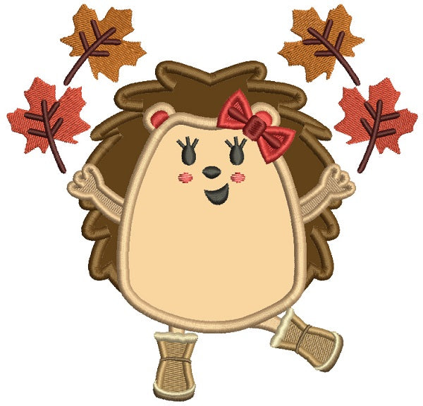 Girl Hedgehog With Leaves Fall Applique Machine Embroidery Design Digitized Pattern