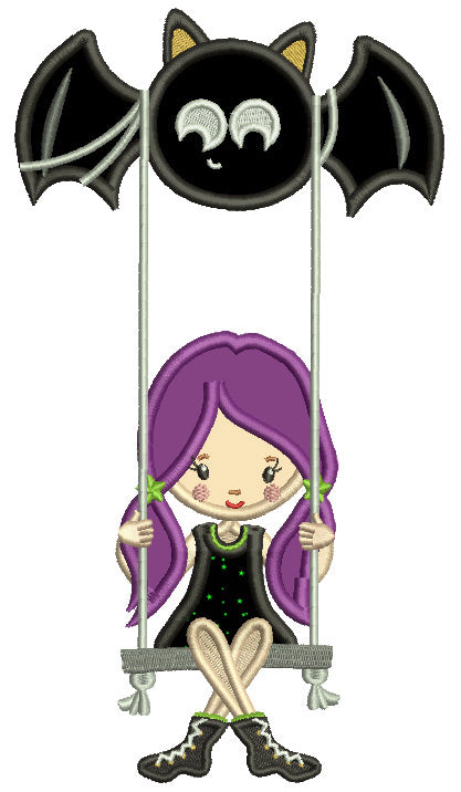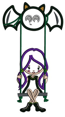 Girl Sitting On A Swing Hanging From a Bat Halloween Applique Machine Embroidery Design Digitized Pattern