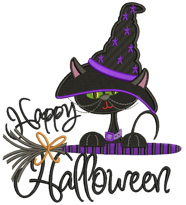 Happy Halloween Black Cat Witch on a Broom Halloween Filled Machine Embroidery Digitized Design Pattern