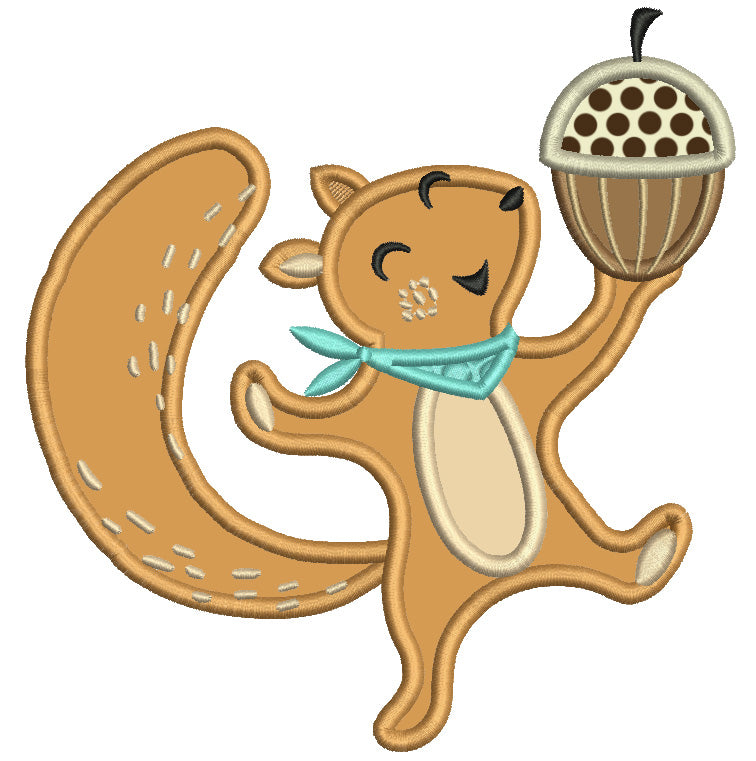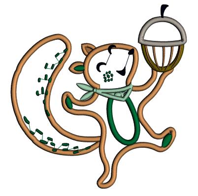 Happy Squirrel Dancing and Holding an Acorn Fall Applique Machine Embroidery Design Digitized Pattern