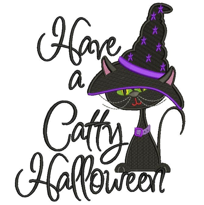 Have a Catty Halloween Black Cat Wearing Witch's Hat Filled Machine Embroidery Digitized Design Pattern