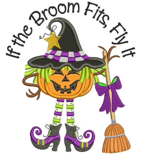 If The Broom Fits, Fly It Pumpkin Witch Halloween Applique Machine Embroidery Design Digitized Pattern