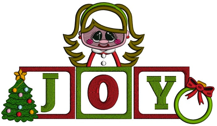 JOY Little Girl With Word Blocks And Christmas Tree Applique Machine Embroidery Design Digitized Pattern