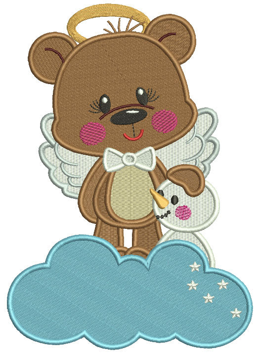Little Bear ANgel On The Cloud With a Snowman Filled Christmas Machine Embroidery Design Digitized Pattern