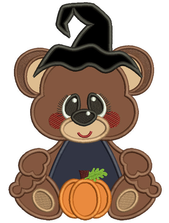 Little Bear Wearing Witch Hat With Pumpkin Halloween Applique Machine Embroidery Design Digitized Pattern