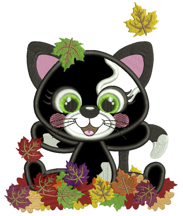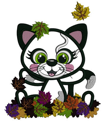Little Black Kitten Playing With Leaves Fall Applique Thanksgiving Machine Embroidery Design Digitized Pattern