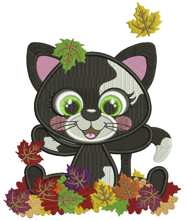 Little Black Kitten Playing With Leaves Fall Filled Thanksgiving Machine Embroidery Design Digitized Pattern