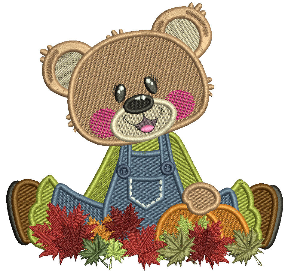 Little Boy Bear Farmer Sitting With a Pumpkin And Fall Leaves Thankgiving Filled Machine Embroidery Design Digitized Pattern