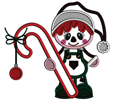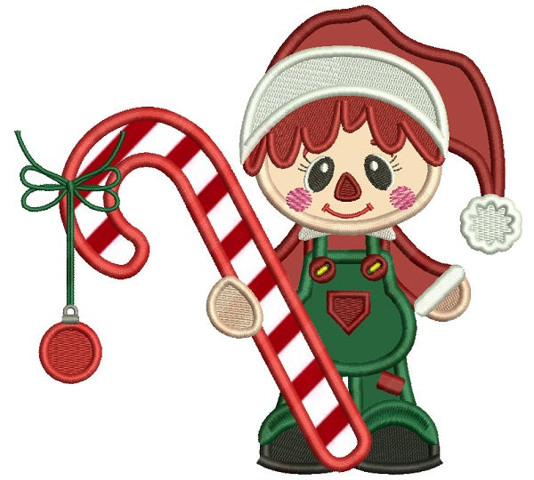 Little Boy Holding Big Candy Cane Wearing Santa Hat Applique Machine Embroidery Design Digitized Pattern