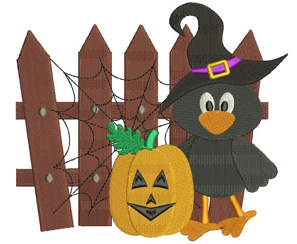 Little Crow In a Witch Hat and Pumpkin Spider Web Halloween Filled Machine Embroidery Design Digitized Pattern