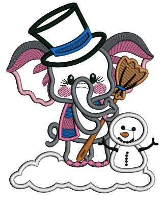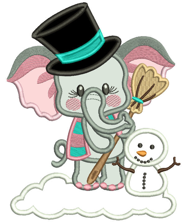 Little Elephant With a Broom And a Snowman Christmas Applique Machine Embroidery Design Digitized Pattern