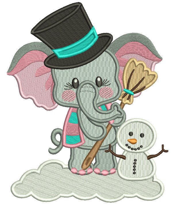 Little Elephant With a Broom And a Snowman Christmas Filled Machine Embroidery Design Digitized Pattern
