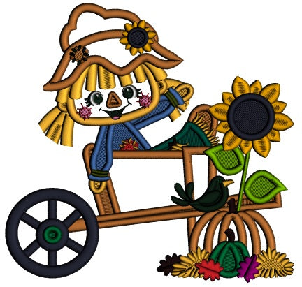 Little Farm Girl Sitting Inside Wagon With Pumpkins And Sunflower Thanksgiving Applique Machine Embroidery Design Digitized Pattern