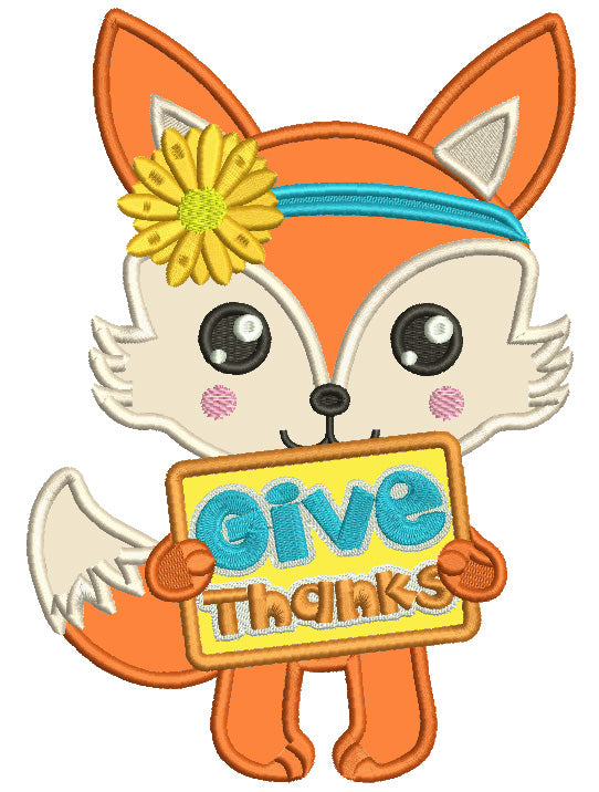 Little Fox Holding Give Thanks Sign Thanksgiving Applique Machine Embroidery Design Digitized Pattern