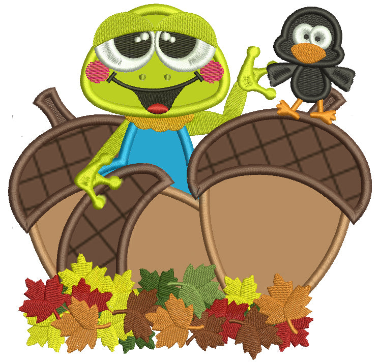 Little Frog With a Bird And Acorns Fall Applique Machine Embroidery Design Digitized Pattern