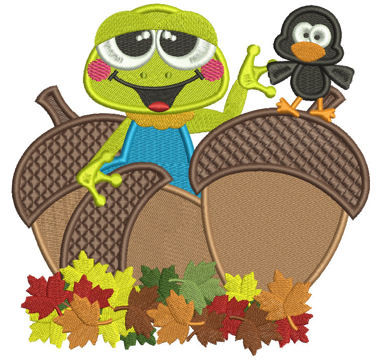 Little Frog With a Bird And Acorns Fall Filled Machine Embroidery Design Digitized Pattern