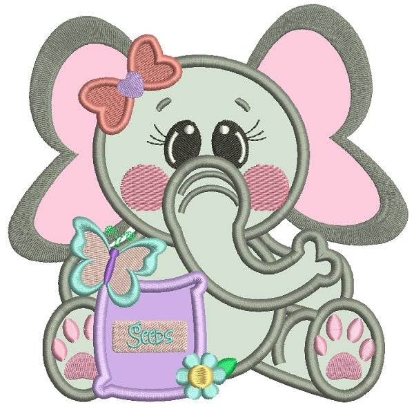 Little Girl Elephant Holding Flower Seeds Applique Machine Embroidery Design Digitized Pattern