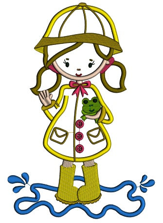 Little Girl Wearing Rain Coast Holding a Frog Applique Machine Embroidery Digitized Design Pattern