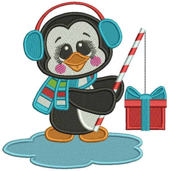 Little Penguin Fishing For Presents Christmas Filled Machine Embroidery Design Digitized Pattern