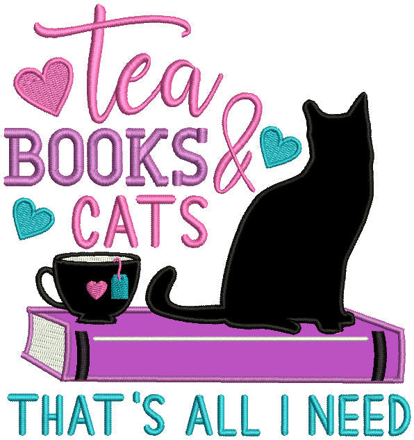 Tea Books Cats That's All I Need Applique Machine Embroidery Design Digitized Pattern - 12219