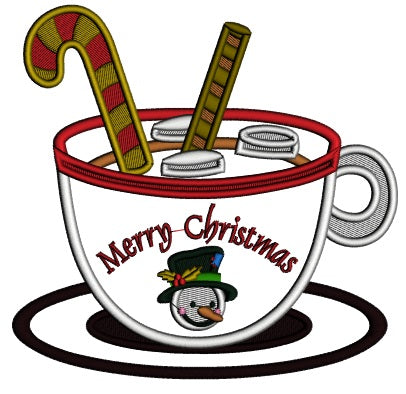 Merry Christmas Hot Cocoa Cup With Snowman Applique Machine Embroidery Design Digitized Pattern