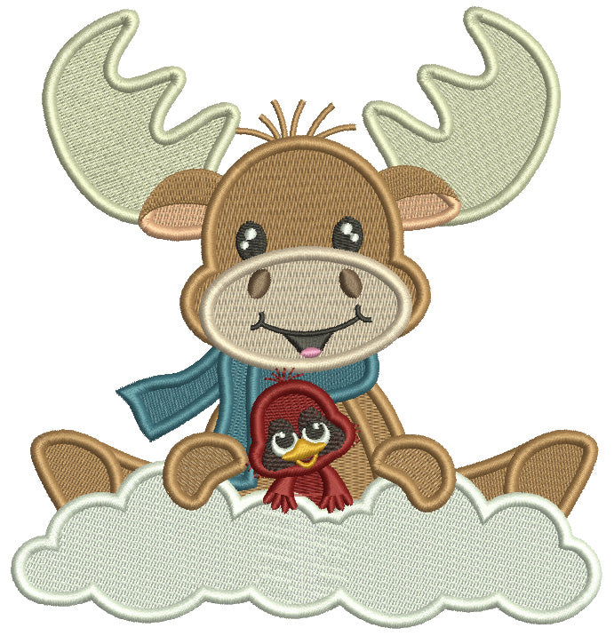 Moose On The CLOud With Little Bird Christmas Filled Machine Embroidery Design Digitized Pattern