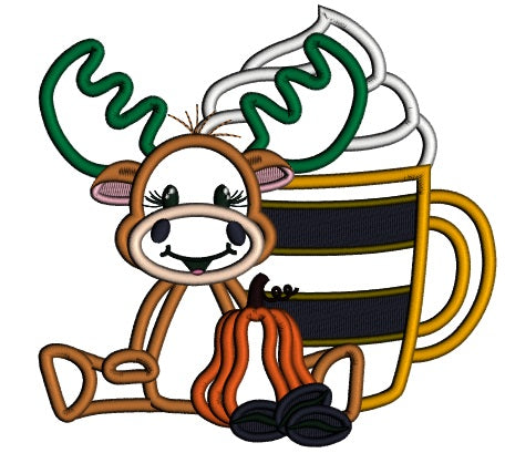 Moose With a Big Coffee Cup Fall Applique Thanksgiving Machine Embroidery Design Digitized Pattern