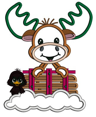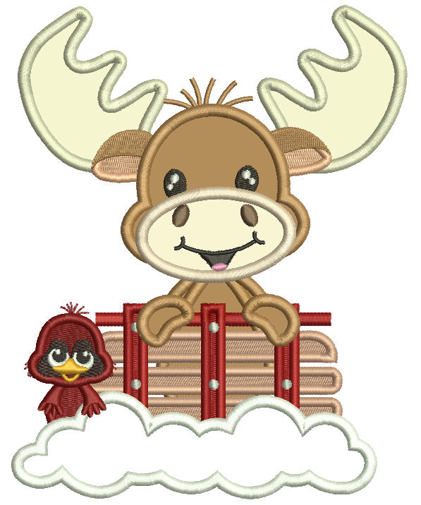 Moose With a Bird And Snow Christmas Applique Machine Embroidery Design Digitized Pattern