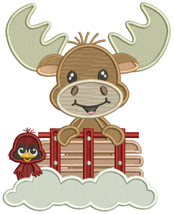 Moose With a Bird And Snow Christmas Filled Machine Embroidery Design Digitized Pattern