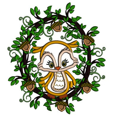 Owl Sitting On a Wreath WIth Acorns Fall Applique Machine Embroidery Design Digitized Pattern
