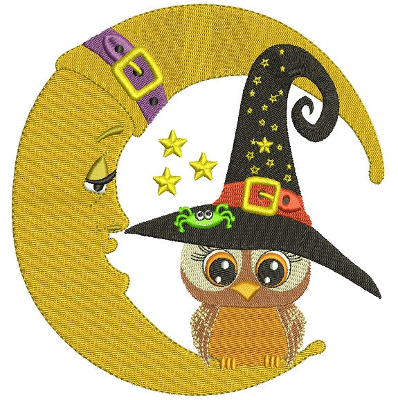 Owl Wearing Witch Hat Sitting On The Moon Halloween Filled Machine Embroidery Design Digitized Pattern