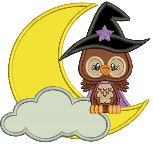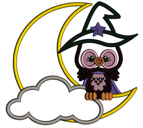 Owl Wizard Wearing Big Hat Sitting On The Moon Halloween Applique Machine Embroidery Design Digitized Pattern