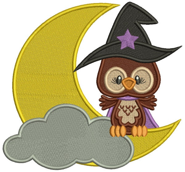 Owl Wizard Wearing Big Hat Sitting On The Moon Halloween Filled Machine Embroidery Design Digitized Pattern