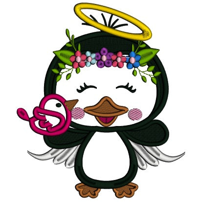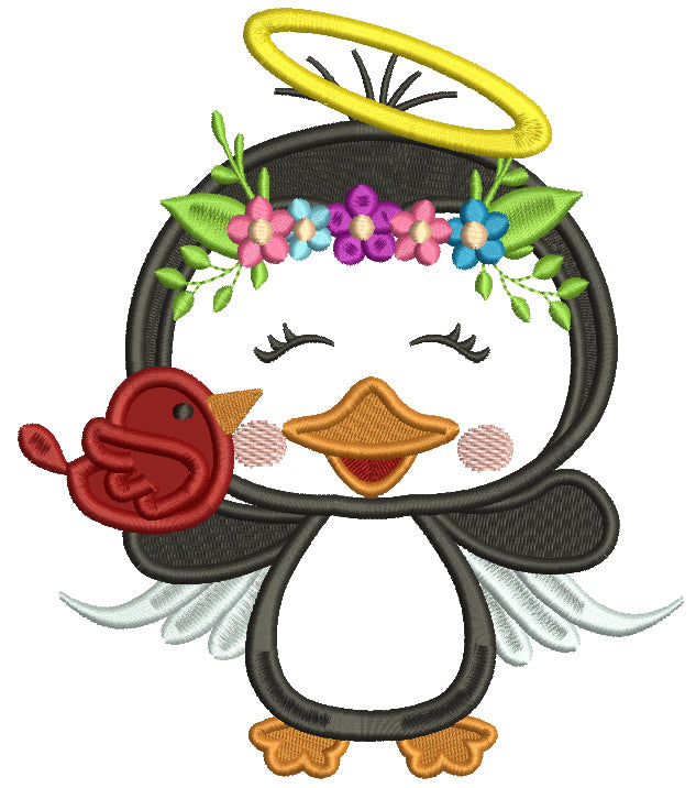 Penguin Angel Holding a BIrd Applique Christmas Machine Embroidery Design Digitized Pattern