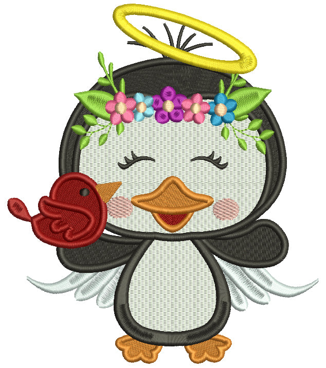 Penguin Angel Holding a BIrd Filled Christmas Machine Embroidery Design Digitized Pattern