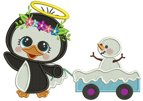 Penguin Angel Pulling Wagon With Snowman Filled Christmas Machine Embroidery Design Digitized Pattern